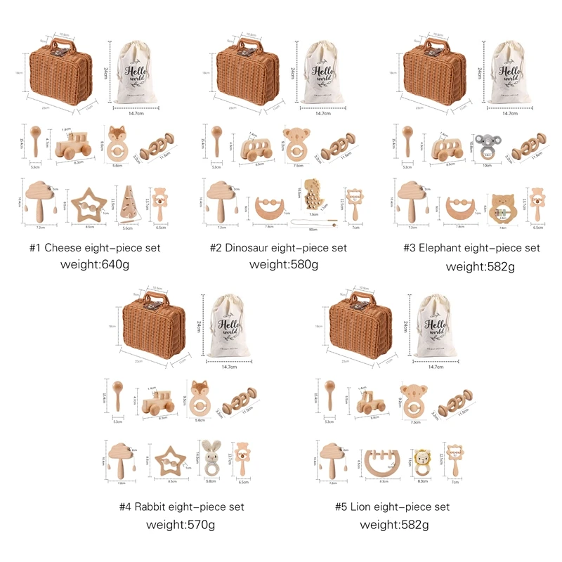 1Set Baby Animal Wooden Rattles Crochet Lion Set Milepost Birth Commemorate Cane Beech Set Montessori Birth Vintage Box Gifts